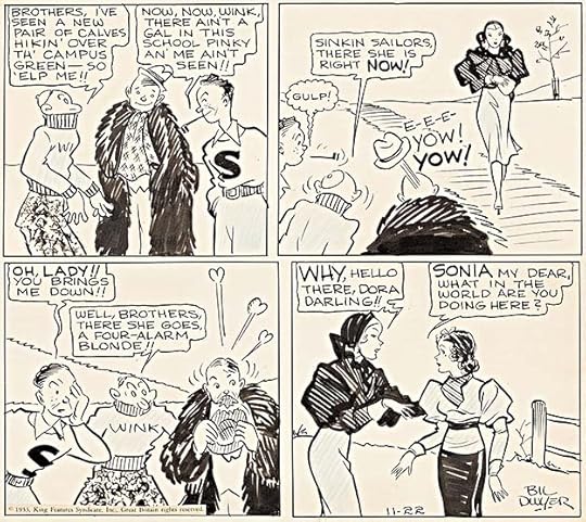 I called him just socially and told him I was in town to say hello. I didn’t know where he lived, on Christopher Street. I didn’t even know where Christopher Street was. So he said, “My God, I’m glad you called! I’ve got a problem here. Come on down!” This was like the first night I was in town and he had been submitting things to King Features and selling gags, by the way, to the magazines, Colliers and The New Yorker. Anyway, he had submitted a gag-type strip to King Features and he got a call back saying that Paul Fung was being pulled off DUMB DORA and Dwyer had the assignment. Here he was suddenly with six strips and a Sunday page to do and he’d never done anything except single panels. And he was in trouble. Frank Engli was helping him…he did the lettering.