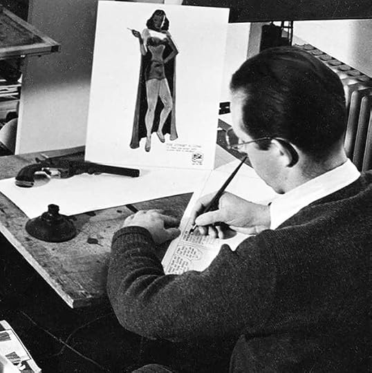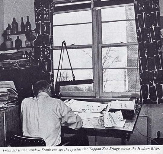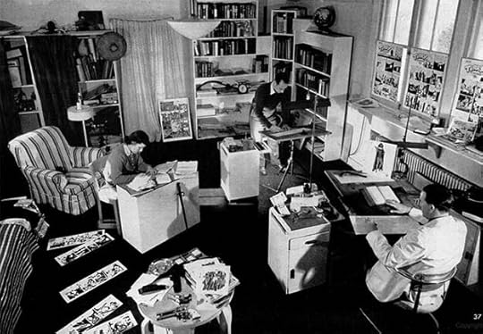 Before Engli was in the new arrangement for long, Noel Sickles became bored with SCORCHY SMITH and moved on to commercial illustration. His last strip ran Oct 24, 1936. Engli and Caniff continued to work together on TERRY AND THE PIRATES. By 1941, TERRY had become a great success, and Caniff was able to have a much larger studio with places for his secretary, and Frank Engli, seen at upper center above.
