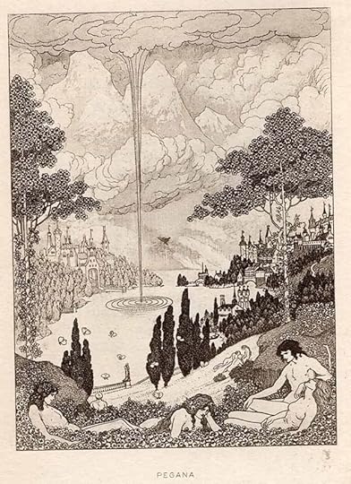 This is not really a book of stories, it’s mostly a briefly outlined mythology created by the author, Edward John Moreton Drax Plunkett, 18th Baron of Dunsany, in 1905. The style has several influences, including Celtic mythology, Hindu mythology, possibly Chinese mythology, and perhaps “The Arabian Nights.” Dunsany (rhymes with unrainy) was also reading Nietzsche at the time, and there are element of irony and humor perhaps picked up there, as well as the seemingly unorthodox beliefs of the author. Dunsany’s gods have a hierarchy, with MANA-YOOD-SUSHAI at the top, who created the lesser gods, then settled down to a very long nap that will only end when all his creations do. The lesser gods, each with powers and specialties, create worlds in which to meddle from their home in lofty Pegana, worlds inhabited by men and animals and so forth. This is the game of the gods, and we are their playground, it’s suggested. Some of the pantheon are Kib, sender of life, Sish, destroyer of hours with his hound Time, Slid, god of streams, rivers and oceans, Mung, god of death, Limpang-Tung, god of mirth and minstrels, and Yoharneth-Lahai god of dreams and fancies. Below this pantheon are the lesser or home gods, who live among men and not in Pegana, with specialties as specific as Pitsu who strokes the cat and Hobith who calms the dog.