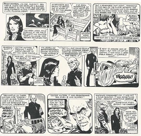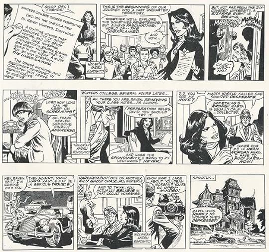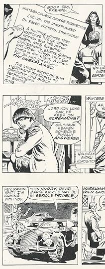 Three dailies on a single page as they would have gone to buyers, I’ve also added some panels enlarged to show the lettering and art better. The strip looks like one I would have enjoyed reading. The lead character, Dr. Raven Winters, might have had some connection to Baron Winters in the comics series NIGHT FORCE by Wolfman and Gene Colan published by DC in 1982, or maybe Marv just liked the name and reused it.
