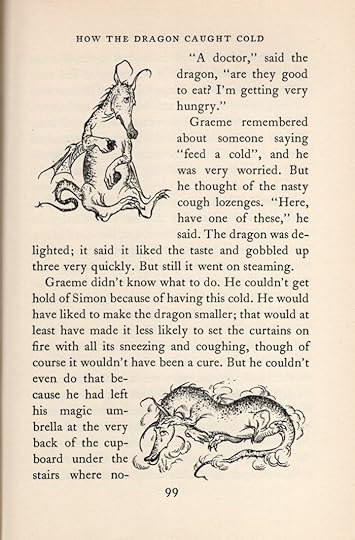 Graeme lives with his sister Petronella and his parents in a home in suburban England, probably near London. His friend Simon lives next door, and they sometimes play together. Graeme is fond of making bonfires, and in a way that would probably not be allowed in a children’s book today, he loves to set fires of any kind. One day while preparing a bonfire at the back of his garden, he finds a baby dragon, who is happy to help set the fire alight with his breath. The dragon has an appealing personality, he’s vain, and crafty, and at times disobedient, getting Graeme and Simon in trouble until they learn how to control him with the help of a magic umbrella they find that can change his size. Each chapter is an amusing story, and many were originally told by the author on the BBC radio program “Children’s Hour.” Logic is set aside, but humor and cleverness abound. Social satire is also present in some stories.