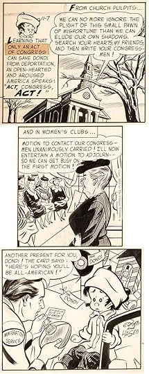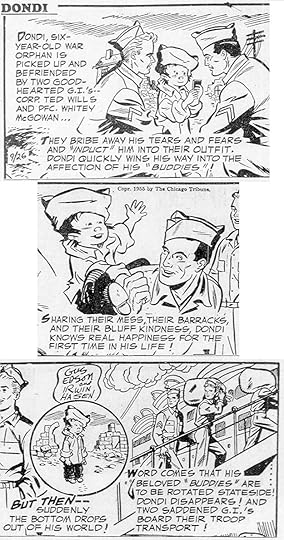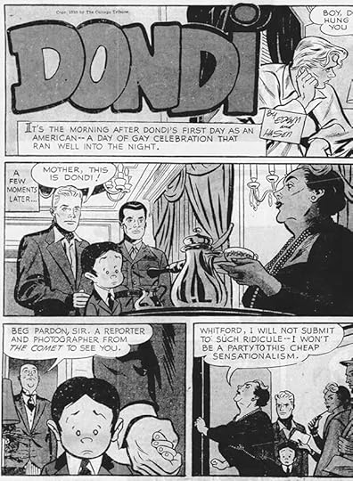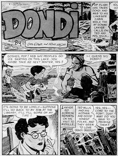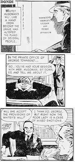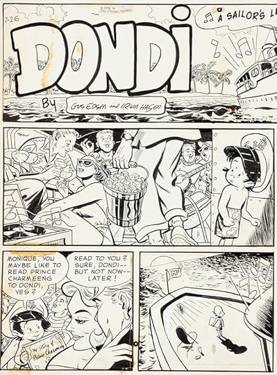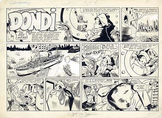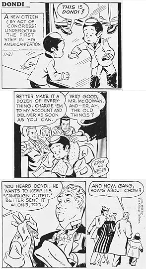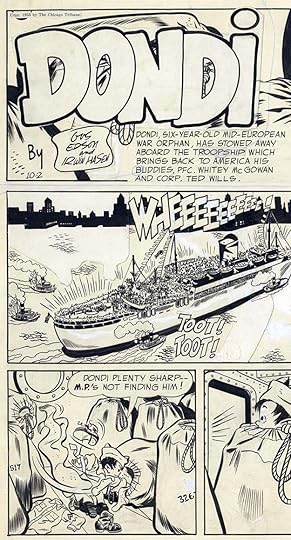 Here’s original art from an early Daily lettered by Gaspar, who I think also lettered the signs in the last panel, and maybe the signatures over Hasen’s pencils. As you can see, Dondi has arrived in America. Later he would always have black circle eyes, here they’re not quite that yet.