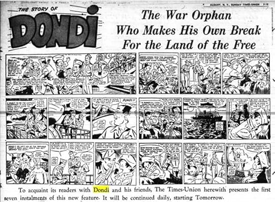 This promotional piece from another paper is from an article on The Daily Cartoonist website by D.D. Degg. I think the DONDI logo is all Hasen, and it shows he knew what he wanted, but the execution is uneven, particularly the second D. I suspect he asked Gaspar to do an inked revision for the first Sunday strip, and it appeared as above for some time. The Saladino inking clue is the way the letters are first outlined with a thinner pen, which remains in some places, then the outer edge of the entire logo is gone over with a heavier outline to read better. The letter shapes are more consistent, too.