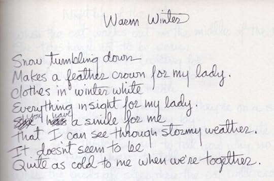 When I began preparing for this music project, I made a list of all my songs in chronological order, as I planned to post them. I thought everything on my list had been recorded (ones I had never recorded weren’t on the list), but when I got to early 1979 recently, I found there were two songs I remembered well, but hadn’t recorded. This is the first of them. I wanted to include them, so I made new recordings in the last two weeks. Here’s the song: Warm Winter