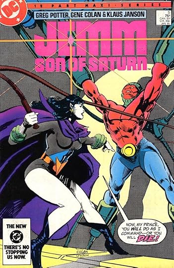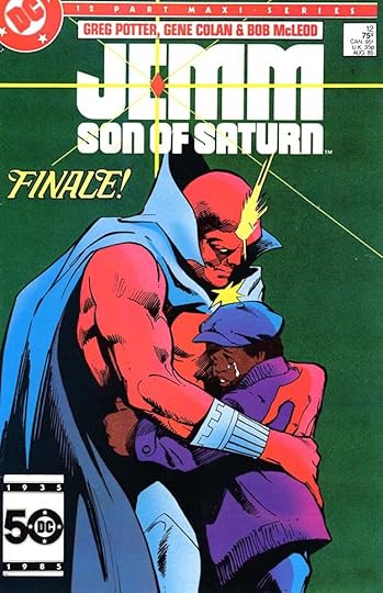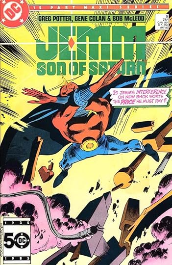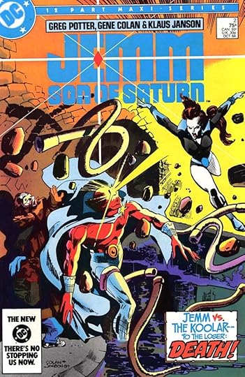 This article is for DC Comics titles beginning with J that didn’t have enough Gaspar Saladino work to warrant a separate article. All the entries are for cover lettering. First up is JEMM, SON OF SATURN, a twelve-issue series of 1984-85, which had Saladino lettering on eight of its covers. The blurb on the one above uses several appealing display lettering styles with the emphasis on DEATH, as it often is in comics.