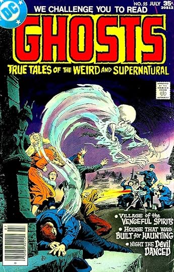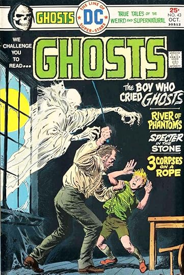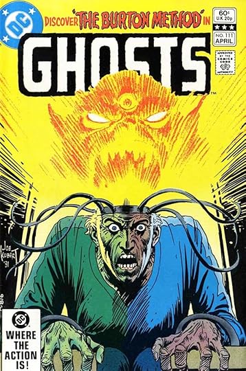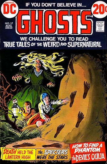 On a black backround, the caption boxes weren’t needed, giving Gaspar more room for the story titles, which then could be larger. These are all inked in black and then reversed by the DC production department. The word GHOSTS in the first story title is done with a dry brush to add texture.