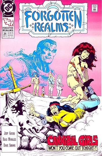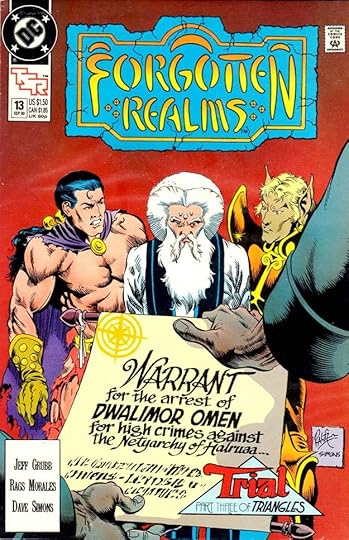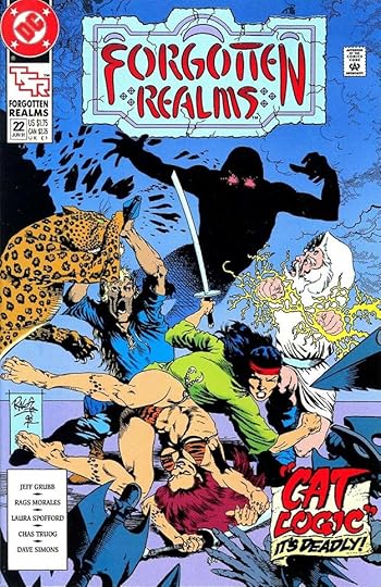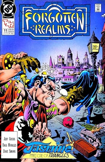 FORGOTTEN REALMS was one of several collaborations with the game company TSR. The DC comic ran 25 issues from 1989 to 1991. Gaspar lettered six of the covers. This one had an elaborate treatment of JASMINE, though the J almost reads as a T, and the M is not so readable either. I like it anyway.