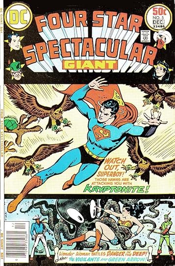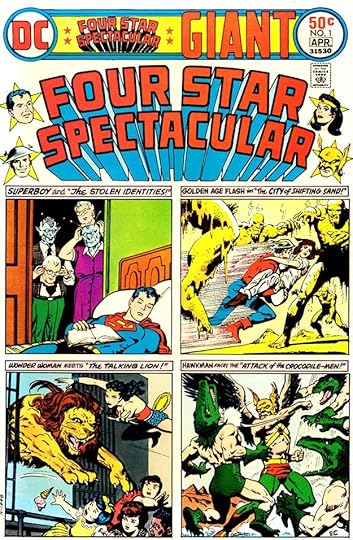 This was a superhero reprint title that ran six issues from 1976 to 1977. Gaspar’s lettering on the first one is small titles over each image. I would have suggested putting each on two lines to allow them to be larger.