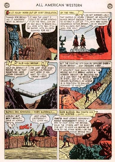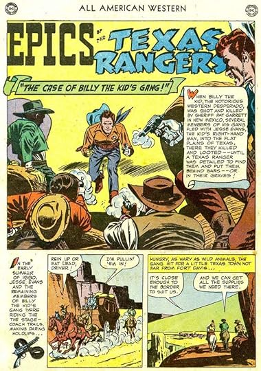 After ALL-AMERICAN WESTERN, another Schwartz title, changed format to war stories edited by Robert Kanigher with the June-July 1952 issue, the most successful features there moved to this title, bumping out some that perhaps were not as popular. Johnny Thunder was one, and it eventually became the lead feature in this book. The western sheriff character was similar to many on TV. Gaspar’s balloon shapes are made with looping ovals that sometimes become quite angular, as in the first panel, and the thought balloon in panel 5 is about the same except for the tail made of bubbles.