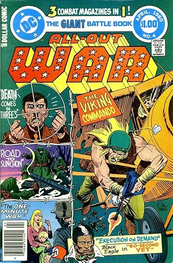 It was about a year after the infamous “DC Implosion,” when management cut almost half the comics line and laid off some staff. The company was beginning to make a comeback thanks in part to the success of the first Superman movie released in December 1978. The Dollar Book line was doing well enough that it was decided to add a war title, and rather than have it be reprints, most of the content was new. This was a relief to creators whose work had been cut back like writer Robert Kanigher, and some of the war artists like George Evans, Gerry Grandenetti and Joe Kubert, and also to letterer Gaspar Saladino. War comics had always been one of his favorite genres, and he jumped into this one gratefully, lettering a majority of the stories and covers. I designed the logo and I think Joe Letterese did the lettering on the first cover,but from the second issue on, it was all Gaspar cover lettering, as seen above, and no one did it better, especially on war books. Editor Murray Boltinoff and Kanigher were pulling out all the topics they thought readers would be drawn to, like Vikings, air fighters, war dogs, and Nazis. Despite all this enthusiasm, I think sales were only moderate, and the title lasted just six issues, but they were large ones.