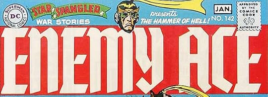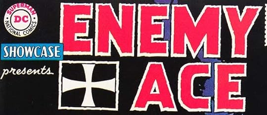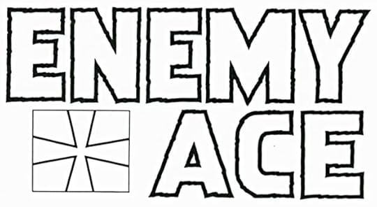 This photocopy of the original logo from the DC files shows the block outlines better as they were lettered, black on white, while the iron cross is a different version. I don’t know which came first, but this is probably a later one. I don’t see it on any covers from the early Enemy Ace appearances.