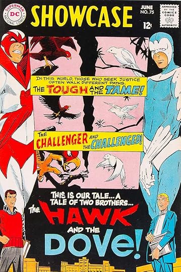 Another Steve Ditko creation was tried out in SHOWCASE with an unusual multiple panel layout, lots of lettering by Gaspar, and a new logo by him at the bottom. He contrasts the warring personalities and ideologies with a rough treatment for HAWK and a calm, smooth one for DOVE but adds an exclamation point. The same logo was used on their brief series minus the exclamation point.