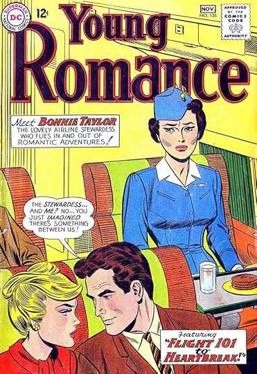 An oval caption with narration from stewardess Bonnie Taylor was used on several covers, about the only time I can think of that it was done. Schnapp’s caption shapes were often more curvy on romance books.