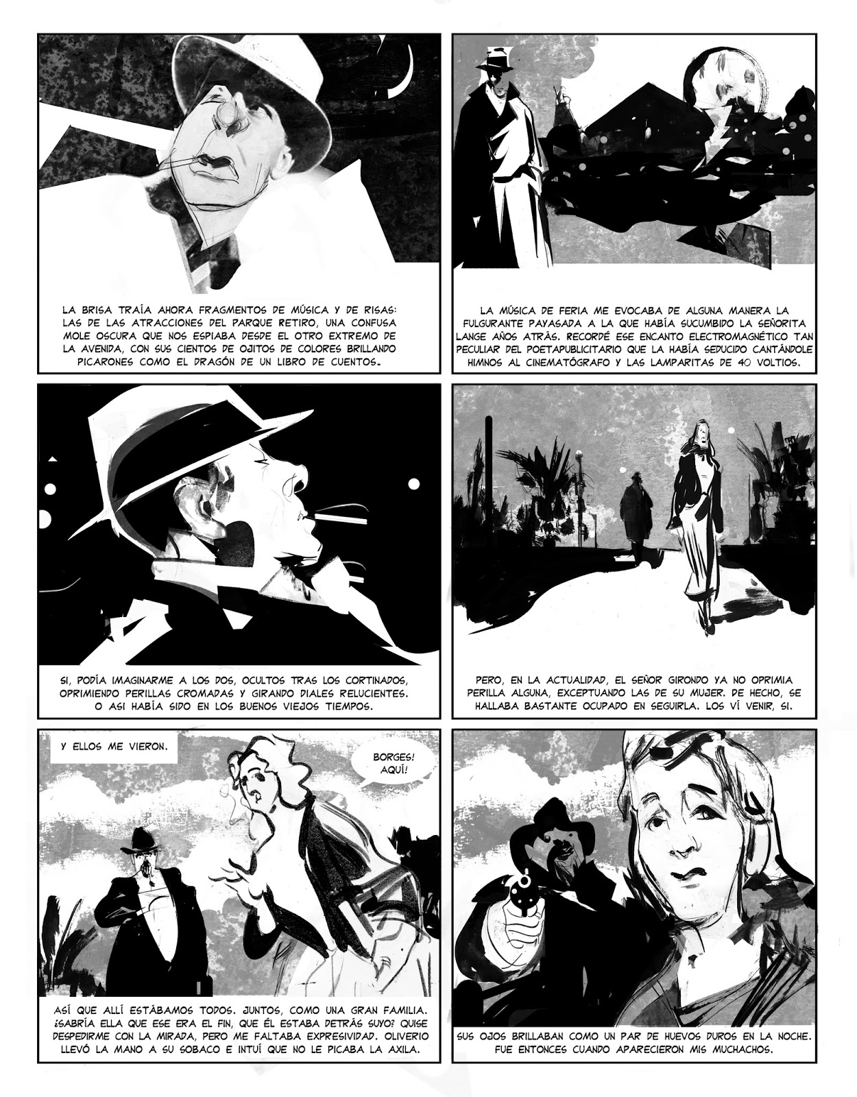 Borges, inspector de aves (historieta aparecida originalmente por entregas en la revista Fierro) se dedica, con plácida inconsciencia, a jugar todos estos juegos, en buena medida ayudada por la naturaleza de su formato.