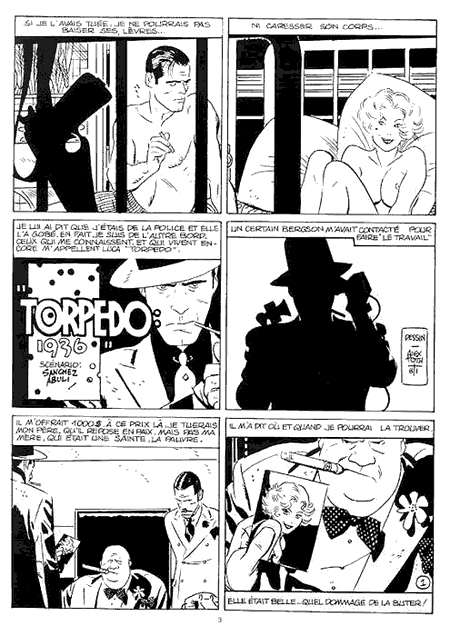 Torpedo no pegaba mucho en Creepy, una revista especializada en terror, ¿no? ¿Por qué crees que Toutain la incluyó en esa revista? He oído decir que lo hizo para subir las ventas de Creepy. Torpedo brilla por un sentido del humor cínico y retorcido que convive con la cruda presentación de los temas y su carga erótica. La mayoría de los chistes se sustentan en juegos de palabras y malentendidos alrededor de la torpeza idiomática del personaje. ¿Eran espontáneos o el chiste era quien originaba la historieta? ¿El humor es la clave que hace a Torpedo diferente? El humor es lo que rescata a Torpedo. Sin humor, sería insoportable. Son sus salidas y sus chistes lo que le hacen “simpático” y le ganan el favor de sus numerosos fans. Es verdad que Torpedo, de origen italiano, no acabó de hablar bien el inglés americano. Por otro lado, los chistes no originan la historieta, sino que esta los va sacando a medida que se desarrolla.