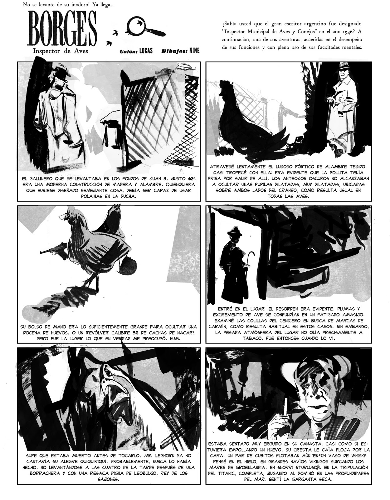 Borges, inspector de aves, de Lucas Nine. En un famoso y conocido episodio ocurrido, Jorge Luis Borges renunció a su puesto en una biblioteca municipal después de ser designado al cargo de “Inspector de Aves y Conejos”.