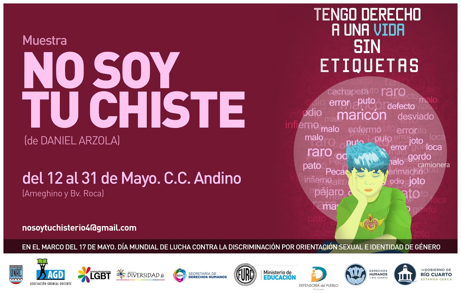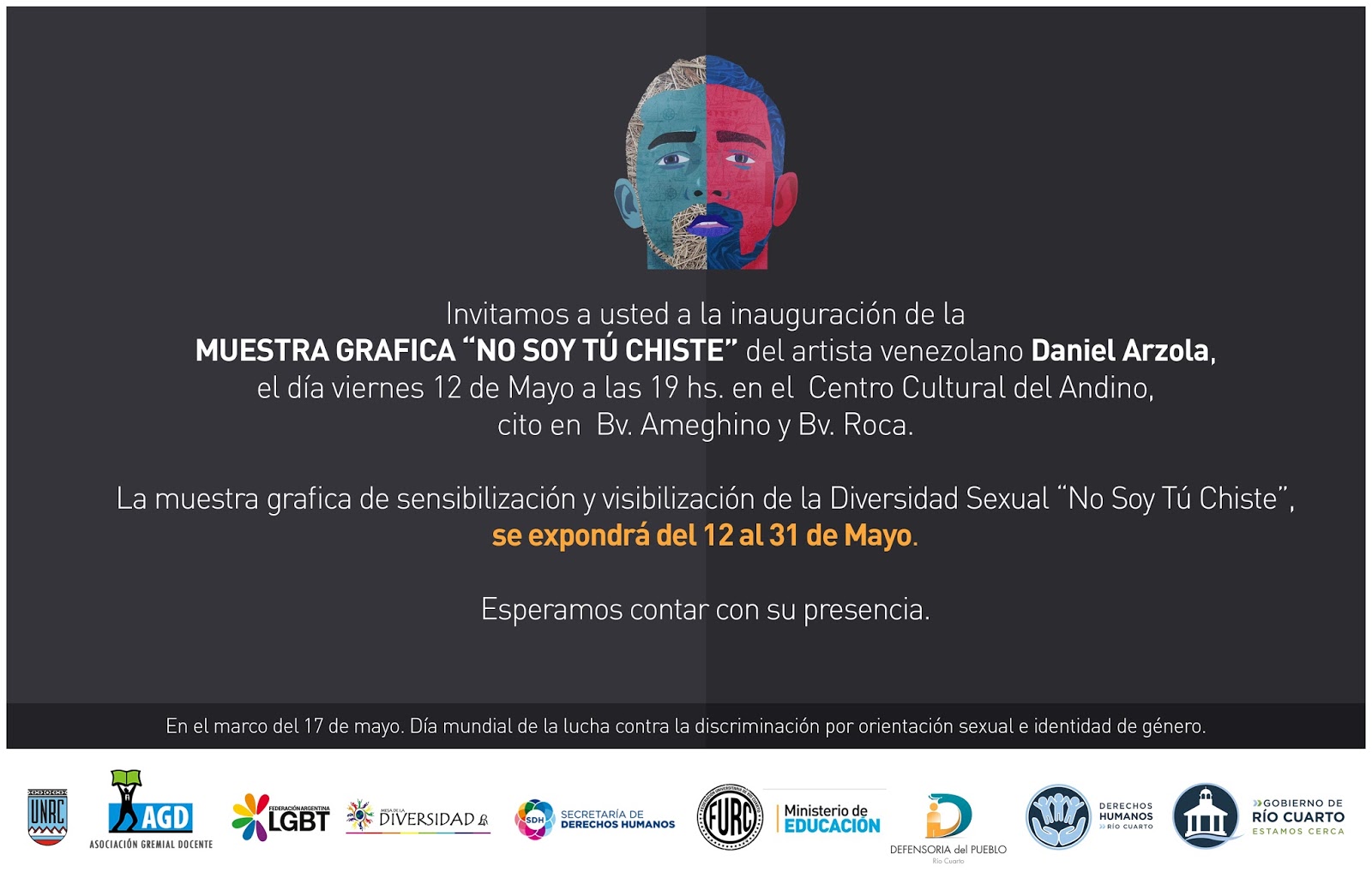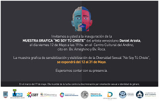 (Información de prensa) En el marco del Día Mundial de Lucha contra la Discriminación por Orientación Sexual e Identidad de Género, que se celebra el 17 de mayo de cada año, están todos invitados a participar de la muestra No soy tu chiste, campaña grafica de sensibilización y visibilización de la Diversidad Sexual (Lesbianas, Gay, Bisexuales, Trans e Intersex), del artista venezolano Daniel Arzola.