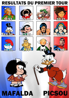 La Ciudad de la Historieta de Angoulême no quiso ser menos; y organizó su propia elección presidencial de la Historieta. De los 12 candidatos postulados, pasaron a la segunda vuelta Tío Rico (16,06%) y Mafalda (15,07%). Quedaron en el camino Gaston Lagaffe (13,09%), Adèle Blanc-Sec (10,71%), Papá Pitufo (10,31%), la Mujer Maravilla (9,92%), Abraracurcix (7,93%), Iznogoud (4,76%), Tarzán (3,57%), Bécassine (3,17%), Achille Talon (2,77%) y Superman (1,98%). A las 18:00 horas del domingo, la Biblioteca de la Ciudad de Angoulême dará a conocer el resultado. ¿Será nuestra Mafalda la primera presidenta de Francia?