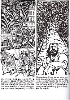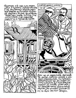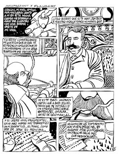 ¿Adaptación libre del cuentoEl Horla de Maupassant, signado porla presencia de la locura que comparten el personaje protagónico y el autor?Podría ser, aunque me parece que se trata, más bien, de una charla abierta yhonesta entre seres sensibles que atraviesan instancias de profundo desgarro.Por eso, quiero creer, gran parte del articulado interno del cómic viene escenificadomediante diálogos entre Maupassant y otras figuras, vivas y muertas, reales eimaginarias, que representan la prédica interior de una pena existencial. Sialguien podía poner este universo en clave gráfica era Sanyú, el historietistaargentino dueño de un trazo visceral, orgánico y latente, capaz de traducircada congoja en una línea silvestre, de envidiable libertad. Aquí lo suyo esmonumental, de una cotidianeidad épica desagregada en multiplicidad de planos ysignos que entrecruzan lo concreto con lo abstracto, lo real con lo simbólico.