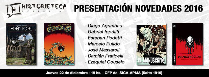 (Información de prensa) Este jueves 22 de diciembre, a las 19:00 horas, en el CFP del SICA-APMA (Salta 1919, Ciudad Autónoma de Buenos Aires), Historieteca Editorial cierra el año editorial con la presentación de sus cuatro novedades 2016: Edén Hotel, El Cartoonero, El manuscrito y Putrefacción.