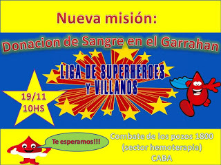 (Información de prensa) Este 19 de noviembre, de 10:00 a 13:00 horas, La Liga de Superhéroes y Villanos Solidarios estará presente en el Hospital de Pediatría Juan P. Garrahan (Combate de los Pozos 1245, Ciudad Autónoma de Buenos Aires) participando de una jornada de donación de sangre.