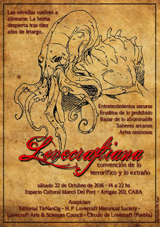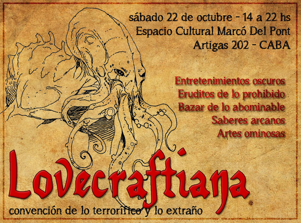 (Información de prensa) Festejando su décimo aniversario, Lovecraftiana 2016, convención de lo terrorífico y lo extraño dedicada a celebrar la vida y la obra de H.P. Lovecraft, se llevará a cabo el 22 de Octubre de 2016, de 14:00 a 22:00 horas, en el Espacio Cultural Marcó Del Pont (Artigas 202, barrio de Flores, Ciudad Autónoma de Buenos Aires).