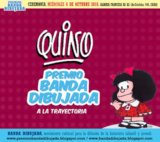 (Información de prensa) El miércoles 5 de octubre a las 19:00 horas, en el auditorio de la Alianza Francesa sede centro (Córdoba 946, Ciudad Autónoma de Buenos Aires) se llevará a cabo la entrega de los Premios Banda Dibujada 2016, donde Quino recibirá el Premio a la Trayectoria.