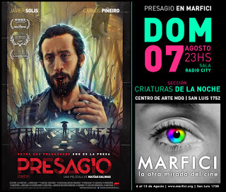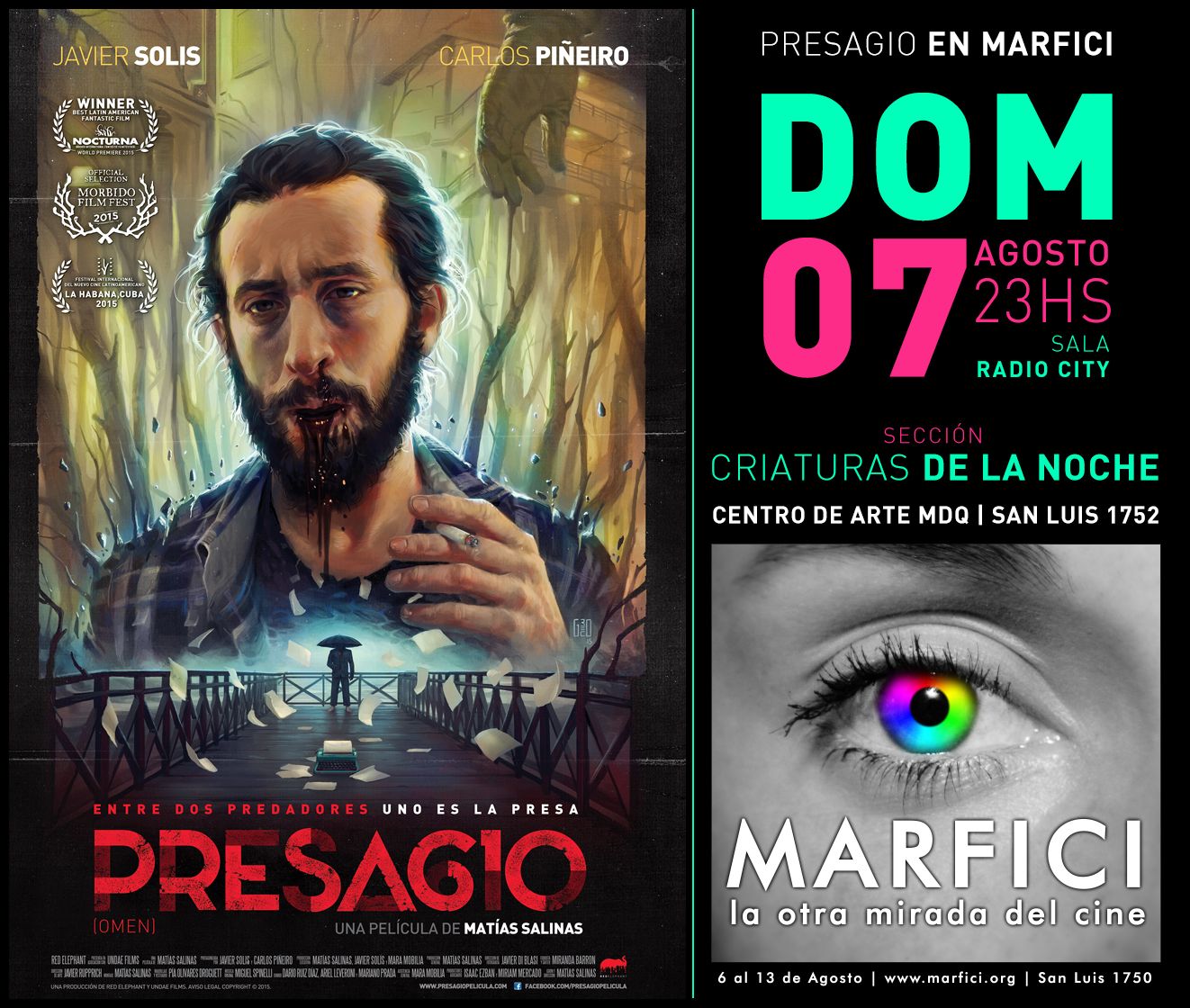 (Información de prensa) Entre dos predadores, uno es la presa. Presagio (Argentina, 2015), opera prima ganadora del premio a Mejor Película Fantástica Latinoamericana en su premiere mundial en el Festival Nocturna de Madrid (España, 2015), llega a la ciudad de Mar del Plata en el marco del Festival Internacional de Cine Independiente Marfici 2016, con una función programada para el domingo 7 de agosto a las 23:00 horas en la Sala Radio City del Centro de Arte MDQ (San Luis 1752), dentro de la sección Criaturas de la Noche. La película de Matías Salinas, protagonizada por Javier Solis, Carlos Piñeiro, Valeria Salinas, Manuel Razzari y Julián Landerreche, tendrá su estreno comercial recién a fines de este año o principios de 2017.