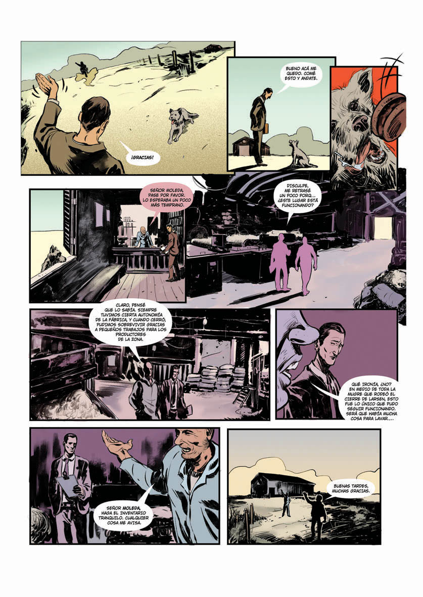 Más allá de la afiatada crónica del desbarranque programado de un proyecto industrial, esta recopilación expandida de la historieta serializada en la revista Lento entre abril y diciembre de 2015, consigue poner en palabras, en rostros, en emociones, la profundidad de las cicatrices causadas por la aniquilación del Estado de Bienestar. No sólo en el desamparo colectivo generado por la retirada de las políticas sociales redistributivas e igualadoras, sino (y sobre todo) en el ámbito privado de las personas, hombres y mujeres a quienes les fue quitado todo, hasta la capacidad de imaginarse felices. Fernando Ariel García
