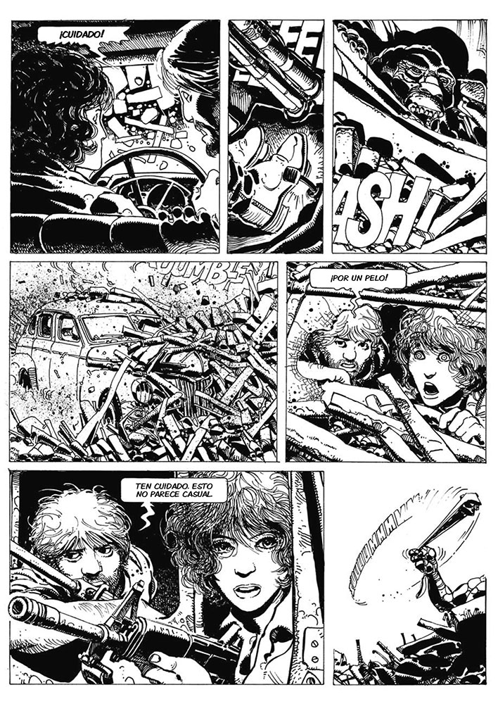 La ciudad de Ciudad es un destino al que he viajado más de una vez, desde que apareció en el mapa de mis lecturas alumbradas por la recuperada democracia. De manera inconexa y desordenada en la española Ilustración + Comix Internacional, incompleta en sus irrupciones argentinas dentro las revistas Tiras de Cuero y Hora Cero (de De la Urraca); y completa en su versión libro con tapa de Ariel Olivetti. Con este millaje a cuestas, me embarqué más que contento a bordo de esta nueva (y definitiva) edición del clásico de Ricardo Barreiro y Juan Giménez a cargo de Doedytores e Historieteca, que incorpora por vez primera las pocas páginas coloreadas por el propio Giménez para una edición a color que nunca llegó a completarse. O que aún está buscando su salida desde algún pliegue espacio-temporal.