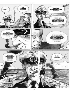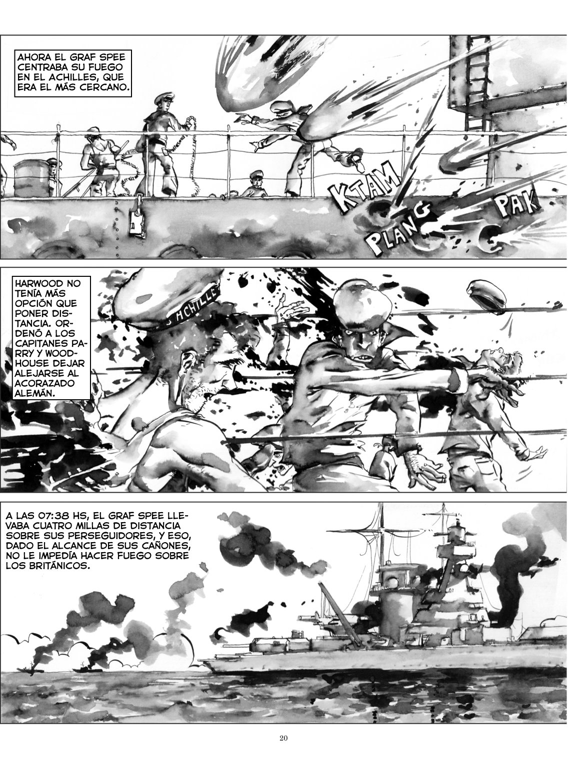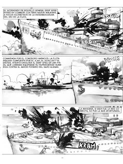 Sé que voy a ser injusto al escribir lo siguiente, pues tanto Santullo como Bergara son dueños de sus propias voces narrativas, pero la lectura del Graf Spee me trajo a la memoria las sensaciones que descubrí al tomar contacto con los mejores episodios del Ernie Pike de Oesterheld y Pratt. Una: La convicción de que, pase lo que pase, uno es el único responsable de las decisiones que tome, más allá de las presiones que genere el entorno. Langsdorff podría haber hundido los barcos con sus tripulantes a bordo. El momento histórico se lo hubiera permitido, sin dudas, pero decidió recoger a todos los marinos que iban a bordo y ponerlos a salvo antes de torpedear los barcos hasta hundirlos. ¿Por qué preocuparse por las vidas del enemigo? Por la misma razón que protegió las vidas de su tripulación al hundir el Graf Spee para que no cayera en manos inglesas. Porque era lo que correspondía hacer. El respeto a la vida, más allá de las banderas, es lo único que nos diferencia de las bestias. Frente a la instancia culminante, el Hombre tiene la opción de abrazar su destino o de dejarse llevar. Hay un precio a pagar, por supuesto; y no todos están dispuestos a asumirlo. Langsdorff sí. Y se hizo cargo.