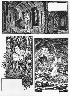 El secreto de la narración oral hecho historieta. El poder absorbente de un relato muy bien contado. Que nos atrapa, nos envuelve, nos seduce hasta devorarnos impiadosamente. Mundos dentro de mundos dentro de mundos que están dentro tuyo, dentro mío, dentro del monstruo bicéfalo que es Eduardo Mazzitelli y Enrique Alcatena, dos que son uno y, desde hace mucho ya, vienen siendo mucho más que dos. Un universo de parajes míticos que nos son engañosamente conocidos, pues los hemos transitado en noches oníricas, los hemos padecido en jornadas de pesadilla, nos hemos perdido en sus laberíntico pasadizos abiertos a la sorpresa.