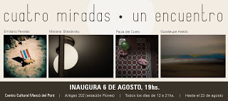 (Información de prensa) El deseo volvió hecho luz. Una luz que sugiere, que muestra y esconde. Somos cuatro fotógraf@s que nos encontramos a partir de la búsqueda fotográfica: Mariana Braslavsky, Emiliano Penelas, Paula del Cueto y Guadalupe Haedo. Así nace Cuatro miradas, un encuentro. La muestra estará expuesta del 6 al 23 de agosto. Y se puede visitar todos los días de 12:00 a 21:00 horas en el Centro Cultural Marcó del Pont (Artigas 202 - Estación Flores, Ciudad Autónoma de Buenos Aires).