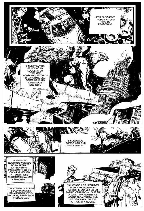 Porque en el mundo de Control de plagas, lo que reina es una invasión de monstruos, vampiros, momias, zombies y todo tipo de criaturas demoníacas, ensañadas con la humanidad cansada de transitar tanta pena y tanta herida. Por suerte (¿por suerte?) contamos con esta especie de artesanales Cazafantasmas que les hacen frente, fumigadores extremos con más resolución e inventiva que tecnología de punta. Cuerpo a cuerpo, con herramientas mecánicas, químicas y/o físicas, le hacen frente a la muerte desdramatizando el percance, pero con la sospecha de una traición carcomiéndoles las entrañas. Duda existencial que, según los autores, será resuelta recién en un futuro segundo tomo.