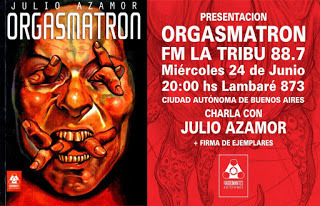 (Información de prensa) Rabdomantes Ediciones tiene el agrado de invitarlos a la presentación de Orgasmatrón de Guillermo Falciani y Salvador Sanz (guionistas); y Julio Azamor (dibujos), en el auditorio de FM LA TRIBU (Lambaré 873, Ciudad Autónoma de Buenos Aires), el miércoles 24 de junio a las 20:00 horas. Habrá charla de Azamor con el público, firma de ejemplares y ¡alguna sorpresa que revelaremos en los próximos días!