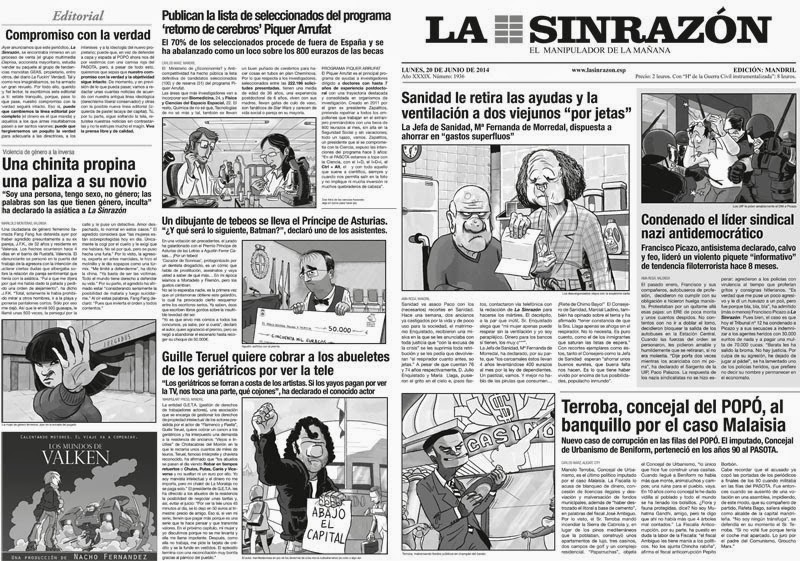 Chorizos es un tebeo de humor, inspirado en la situación política y social de España. Y ya está disponible en la tienda on-line de Grafito Editorial, así como en las librerías que lo deseen. Todos los que compren el que será conocido como el último cómic del bipartidismo, recibirán tres estupendos regalos: Un ejemplar de La Sinrazón, el periódico sensacionalista que informa con el rigor del que más paga; una ilustración firmada por los autores; y los programas electorales de las estrellas del bipartidismo: El POPÓ y el PASOTA. Perfecto para este año de eufórica campaña electoral. Piensa bien a quién vas a votar.