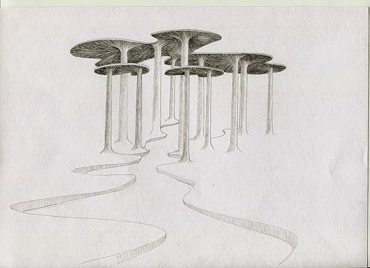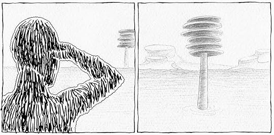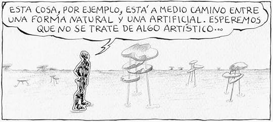 Jorge dibujó solo al personaje, en tinta china. Y Marcela se encargó de los fondos, con lápiz grafito. Luego esos fondos sirvieron de modelo para la producción de otras esculturas y objetos. De esta forma la autoría del proyecto se difumina. Algo similar ocurre en la ficción, porque ¿quién es el protagonista? ¿El planeta o el visitante?