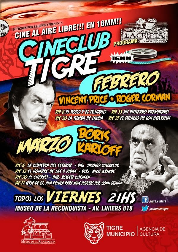Este viernes 6 de febrero vuelve el legendario Cineclub La Cripta a retomar sus proyecciones en fílmico en el marco de las jornadas audiovisuales 24 Tigres por segundo organizadas por la Agencia. La cita será en los jardines del Museo de la Reconquista (Av. Liniers 818, Tigre), a las 21:00 horas, con entrada libre y gratuita, todos los viernes de febrero y marzo. No se suspende por lluvia. El material del presente ciclo consta de copias únicas en formato fílmico. Cada función es acompañada por una variedad sorpresa que puede consistir en series, dibujos animados o publicidades vintage. El Cineclub La Cripta fue fundado en 1999 por el coleccionista y archivista Julio Alejandro Martínez, quien junto a la colaboración de los programadores e investigadores Peter Pank y Boris Caligari, se han dedicado al rescate y exhibición de películas de culto dentro de los géneros Terror, Ciencia-Ficción, Fantasía y Cine Bizarro. El ciclo comenzará con la proyección de El pozo y el péndulo (1961), dirigida por Roger Corman, con guión de Richard Matheson, sobre un cuento de Edgar Allan Poe y protagonizada por Vincent Price, Barbara Steele y Jhon Kerr.