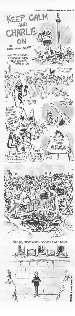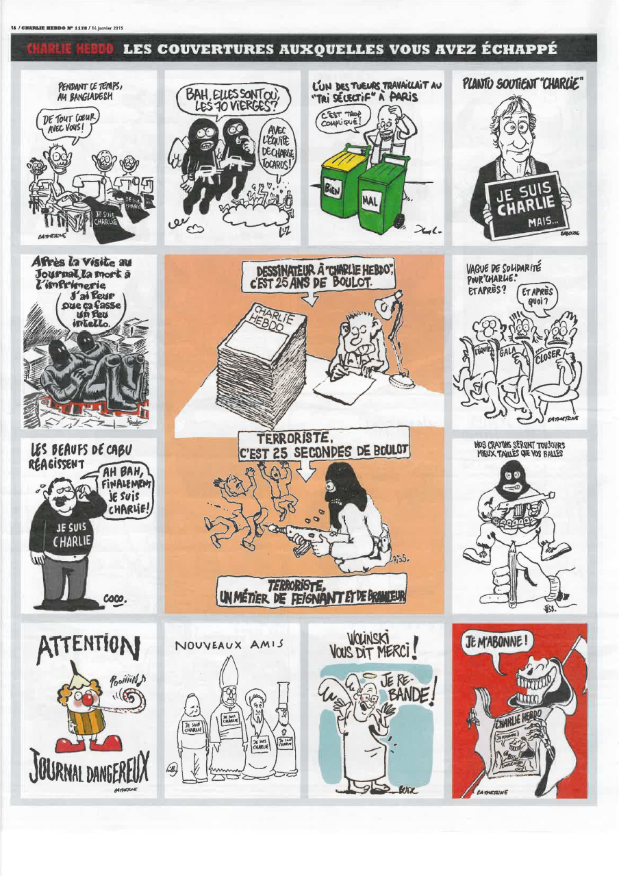 Reafirmación consciente de su identidad y su pertenencia a la tradición satírica francesa, profundizan su humor contestatario, crudo y deliberadamente provocador, brutal en su uso de los estereotipos porque, literalmente, se cagan en el poder, en las estructuras y en los sistemas. Se saben emancipados de cualquier tipo de censura (incluida la autocensura) y de cualquier tipo de tabú; y por ello se la toman con las mayorías y las minorías, con todo aquello que está establecido o en proceso de sacralización. Van más allá (mucho más allá) de la mera representación gráfica, explotando la capacidad de la imagen como documento hipertextual de la época.