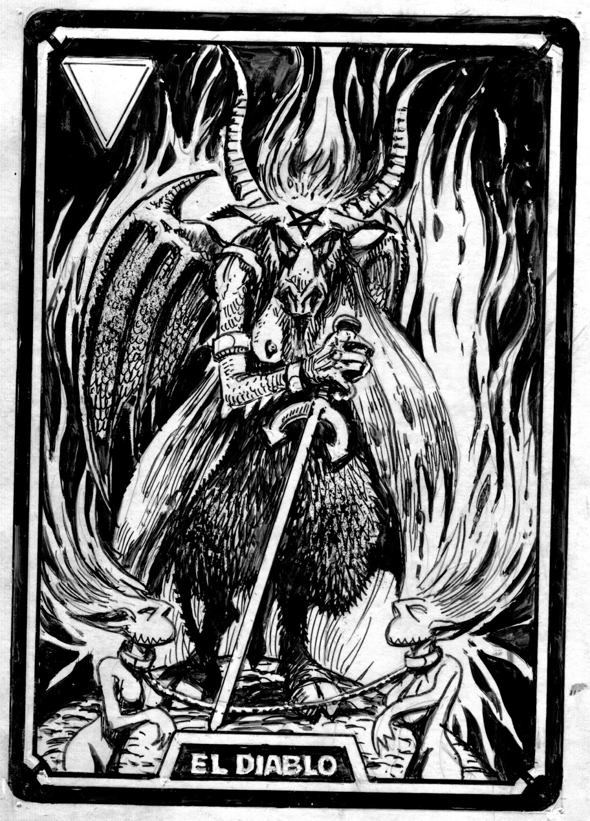 ARCANOS MAYORESEl Diablo: Destino (bueno o malo). Poder de seducción, impulso ciego, tentación, obsesión. Desviación sexual. Un estado mental confuso. Pasión carnal descontrolada. Si aparece invertido: Carta dañina, fatalidad, mal uso de la fuerza. Debilidad, ceguera, desorden. Efectos maléficos. La patética condición humana que prefiere la ilusión a la verdad.