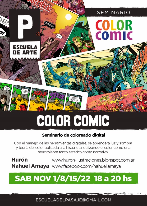 En Noviembre (sábados) arranca Color Comic, seminario de cuatro clases dirigido al coloreado digital de historietas. Temas: Escaneo y limpieza de originales. Teoría del color, paletas y color narrativo. Luz y sombra y monocromía. Aplicado con Adobe Photoshop. Los alumnos de la escuela obtienen un descuento. Si te anotás en el seminario recibís un pase para la Noche de Modelo Vivo.