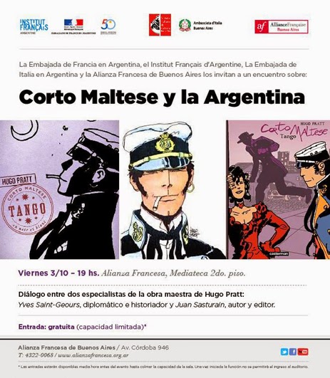 (Información de prensa) La Embajada de Francia en Argentina, el Institut Français d'Argentine, la Embajada de Italia en Argentina y la Alianza Francesa de Buenos Aires los invitan al encuentro Corto Maltese y la Argentina, diálogo entre dos especialistas de la obra maestra de Hugo Pratt: Yves Saint-Geours, diplomático e historiador; y Juan Sasturain, autor y editor. El evento se llevará a cabo el 3 de octubre, a las 19:00 horas, en al Mediateca de la Alianza Francesa (Av. Córdoba 936, Ciudad Autónoma de Buenos Aires). Actividad libre y gratuita, las entradas se retiran media hora antes, en recepción.