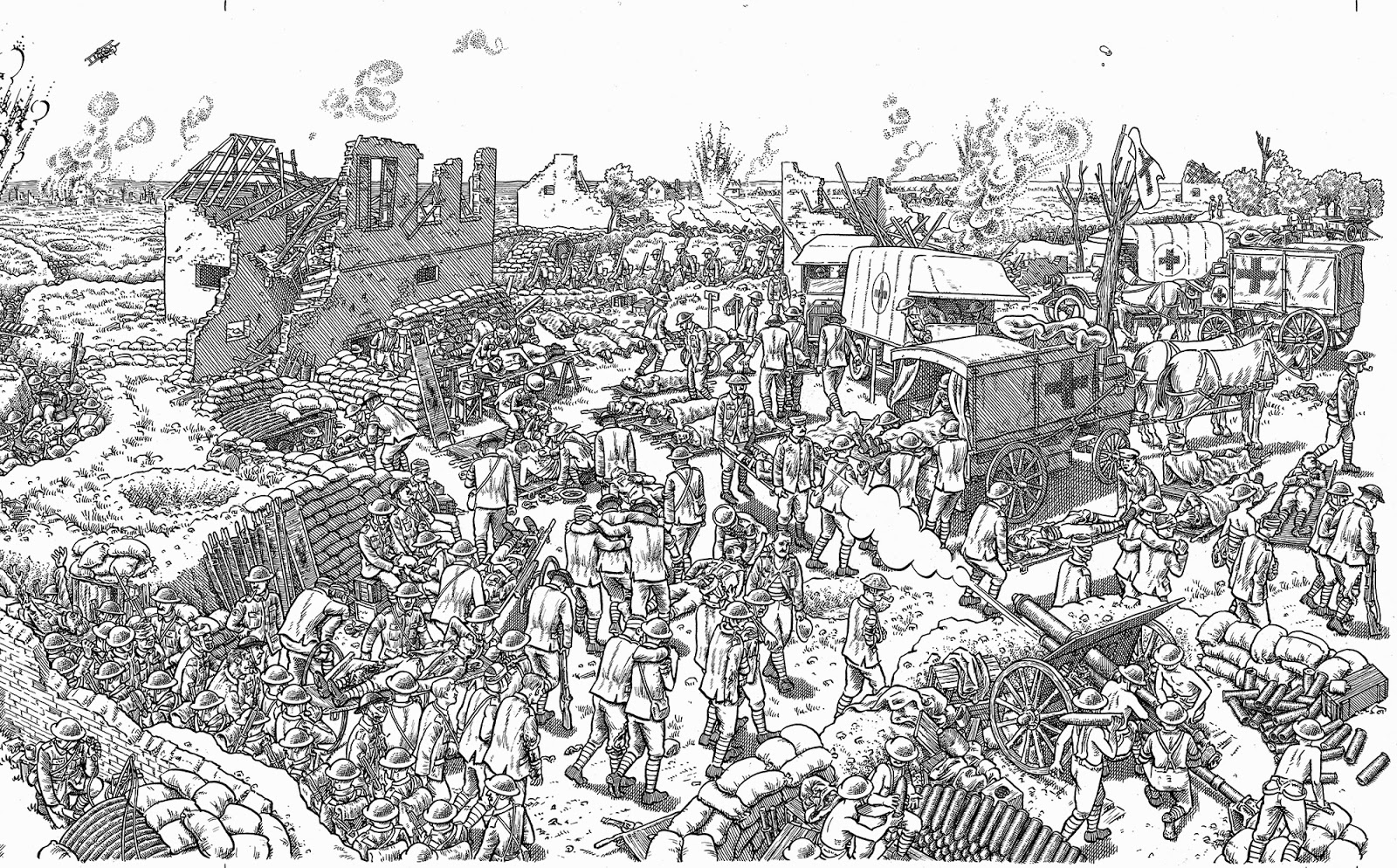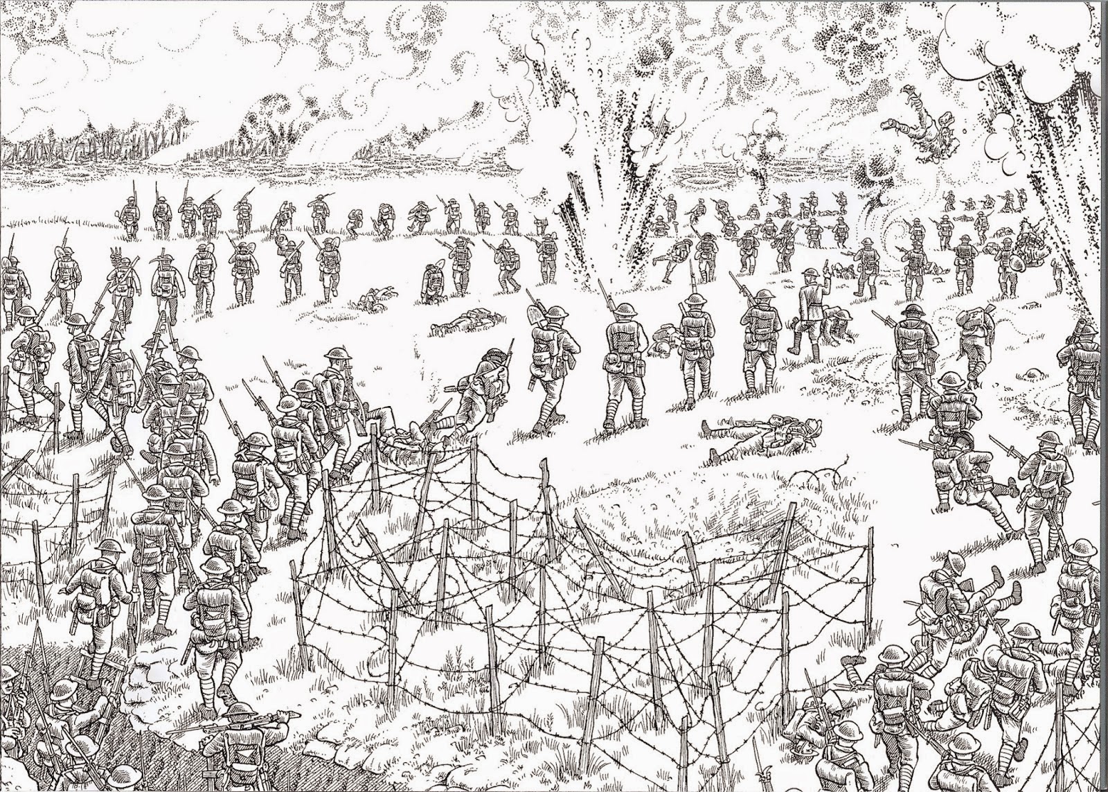 Panorama ilustrado. Así, tan escuetamente, se define esta obra grandilocuente, gigantesca e inabarcable de Joe Sacco, dedicada a contar en una viñeta-acordeón desplegable, la jornada grandilocuente, gigantesca e inabarcable del 1º de julio de 1916, primer día de la batalla del Somme, una de los más largos y (de seguro) sangrientos enfrentamientos de la Primera Guerra mundial. Monumental en su concepción, The Great War conmina todos nuestros sentidos, saturando nuestra capacidad de comprensión, haciendo que el instinto surja como única respuesta ante la avalancha de estímulos que ultiman el corazón de lo humano, instalando en su lugar una coraza de civilización que, de ahora en más, encontrará en los adelantos tecnológicos el avance eficientista de la muerte programada.