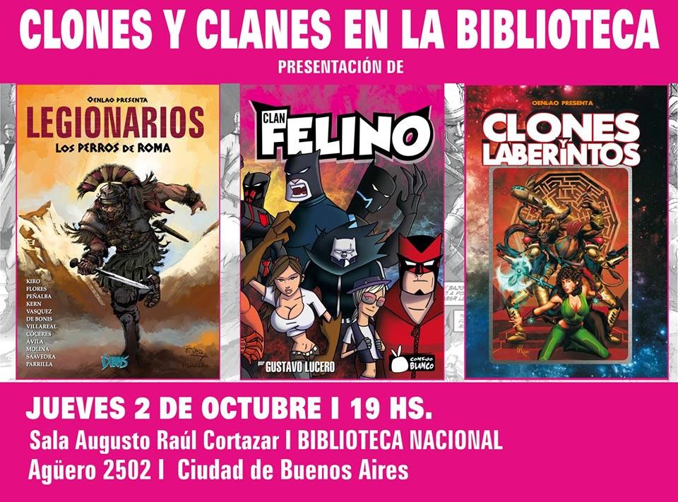 (Información de prensa) Están todos invitados a la presentación conjunta de los libros Clones y laberintos, Clan Felino y Legionarios: Los perros de Roma, a realizarse el próximo jueves 2 de octubre, a las 19:00 horas, en la Sala Augusto Raúl Cortázar de la Biblioteca Nacional (Agüero 2502, Ciudad Autónoma de Buenos Aires).