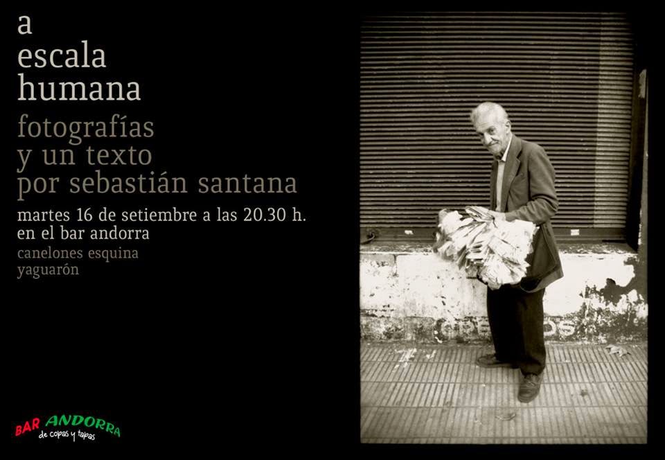 (Información de prensa) Están todos invitados a la presentación de A escala humana, fotografías y un texto por Sebastián Santana, el martes 16 de septiembre, a las 20:30 horas, en el Bar Andorra (Canelones esquina Yaguarón, Montevideo, Uruguay).