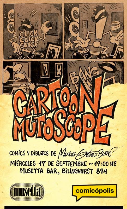 (Información de prensa) En el marco de Comicópolis, Musetta Cafe tiene el agrado de invitarlos a la inauguración de Cartoon Mutoscope, muestra de cómics e ilustraciones de Manuel Gómez Burns, este miércoles 17 de septiembre, a las 19:00 horas, en las instalaciones del bar: Billinghurst 894, Ciudad Autónoma de Buenos Aires.