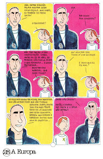 Adjunto al mail, recibí una copia electrónicade 25 de abril aos Quadrinhos, cómic antológico sobre el tema que el Diário deNoticias distribuyó gratuitamente el 26 de abril de 1999. No sabía que existíay no conozco a sus autores, periodistas e historietistas de larga trayectoriaen Portugal, que aquí logran un trabajo realmente emocionante. Son treshistorias autoconclusivas, pero con una característica común surgida de unaidea brillante. Todos los relatos nos vienen contados desde la perspectiva dealumnos de escuelas primarias, en el momento histórico de la Revolución y en1986, cuando Portugal se une a la Comunidad Económica Europea (CEE).