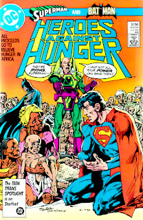 Porcuestiones de producción, las historietas salieron a la ventabastante después de Live Aid. Heroes for Hope starring the X-Men seconoció en diciembre de 1985; y Superman & Batman - HeroesAgainst Hunger, en agosto de 1986. Ambas montaron una estructurasimilar a la del cadáver exquisito, con un equipo creativo diferentealternándose cada dos o tres páginas. Y ambas contaron, básicamente, lamisma historia. Eso sí, evitando las soluciones mágicas, generandoconciencia entre los lectores y promoviendo el compromiso activo dela población a la hora de buscar soluciones colectivas einternacionales a problemáticas concretas que, en ese entonces, sesentían a universos de distancia aunque estaban a la vuelta de laesquina.
