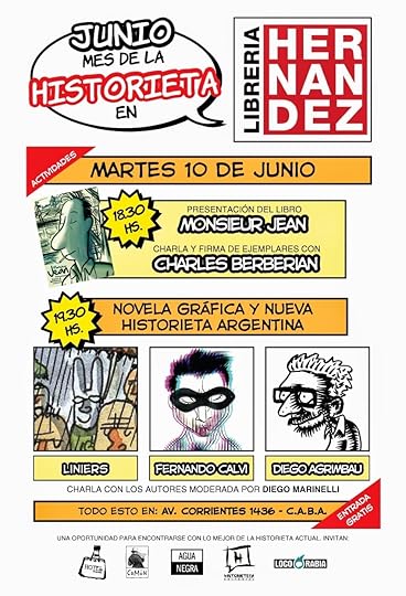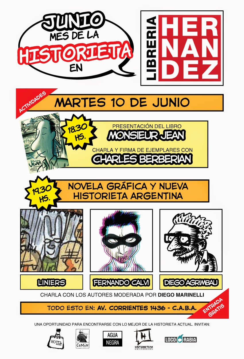 Como inauguración de este mes, el martes 10 de junio a las 18:30 horas se presentará el libro Monsieur Jean, editado por La Editorial Común, con la presencia de su autor, Charles Berberian, también autor de Jukebox , que también firmará ejemplares para el público. A su término, a las 19:30 horas se brindará una charla abierta sobre novela gráfica y nueva historieta argentina. Participarán de ella el dibujante y humorista gráfico Liniers, creador de Macanudo y Los sábados son como un gran globo rojo ; el historietista e ilustrador Fernando Calvi y el guionista Diego Agrimbau, con moderación del periodista Diego Marinelli. La cita es en el auditorio de librería Hernández de Av. Corrientes 1436, Ciudad Autónoma de Buenos Aires. La entrada es libre y gratuita,sujeta a capacidad de la sala.