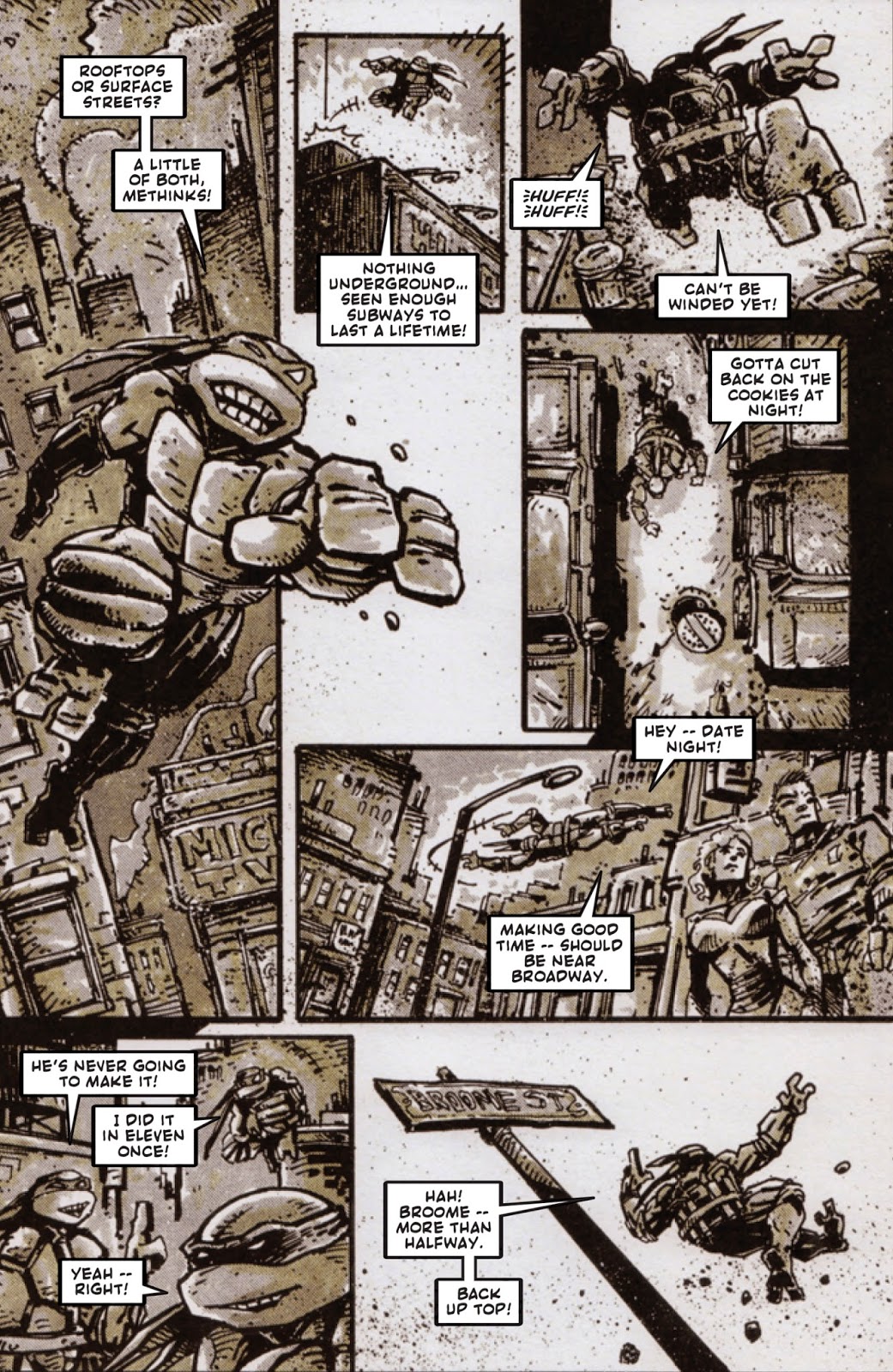 Y para reafirmarme en el error, nada mejor que este número especial de IDW dedicado a celebrar las tres décadas de existencia de Las Tortugas Ninja que, más que quelonios, parecieran ser gatos, por eso de las siete vidas que portan. Siete vidas que deben abordarse como metáfora de los diferentes universos creativos, de las complementarias construcciones simbólicas que Leonardo, Michelangelo, Donatello y Raphael fueron representando a medida que su leyenda crecía y el imperio económico montado a su alrededor se iba diversificando. De aquel origen sombrío, pretendidamente adulto y furiosamente paródico hacia los tópicos más populares de la historieta norteamericana de los ’80 (o sea, los X-Men, los New Teen Titans y el Daredevil de Frank Miller), a la explosión infantojuvenil de los muñequitos articulados y la derivada serie de dibujos animados de los ’90, que los catapultó al estrellato (demostró que el American Dream puede ser algo más que un sueño) y aún hoy les permite sobrevivir a toda manipulación genética que se les realice desde cualquier soporte comunicacional.
